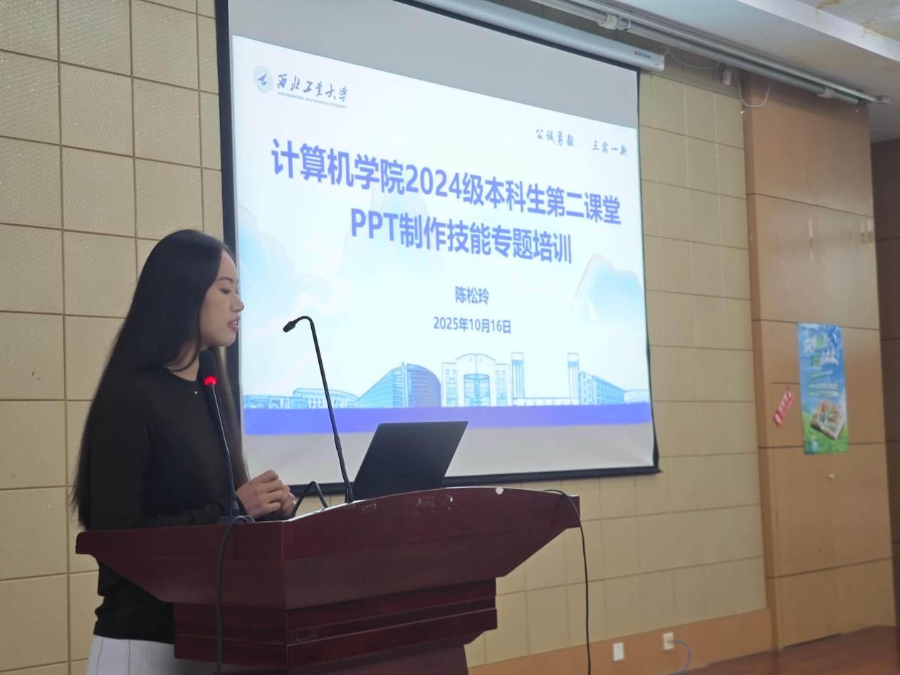 10 月 16 日,计算机学院开展2024级本科生“第二课堂”思政教育活动。本次活动特邀年级 GPA 排名第一的学生张欣杰分享高效学习方法与时间管理策略,同时由兼职辅导员陈松玲讲授 PPT 制作技巧,旨在帮助学生构建清晰知识脉络,以优质视觉化形式呈现学习成果,实现方法论与表达能力的双重提升。